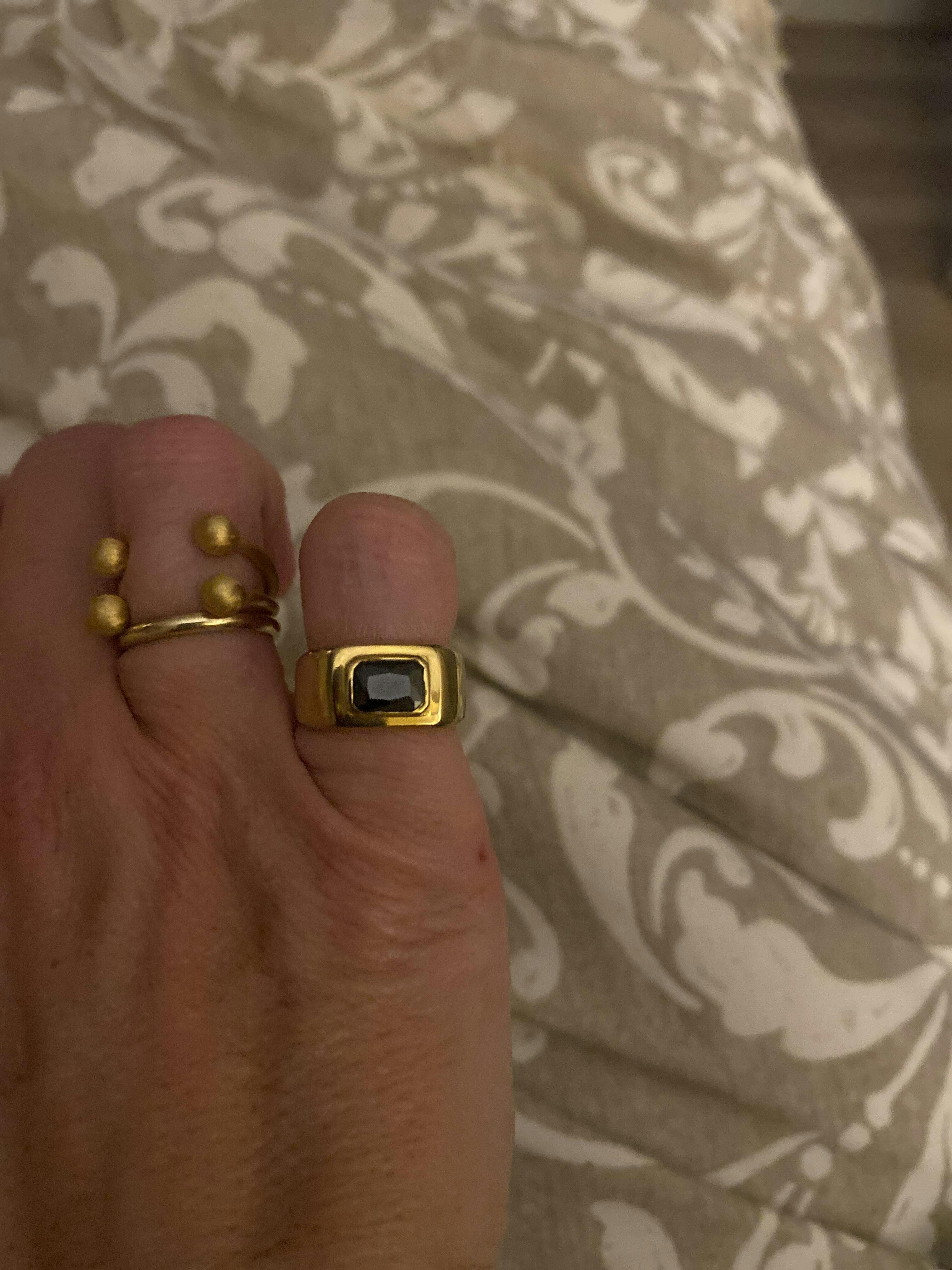 Este anillo no solo es una joya resistente, sino que también es una expresión de estilo. La circonita negra facetada, de tamaño 7 x 5 mm, atrapa la luz de manera sutil, mientras que el dorado del anillo añade un toque de lujo. El grosor de 9 mm garantiza que esta pieza tenga la suficiente presencia sin perder la elegancia.